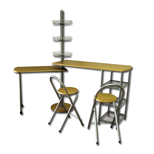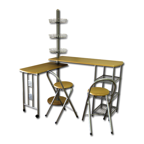 Stôl barový - stôl raňajkový + 2 stoličkyRozmery stolu : 119cm x 45cm x výška 87cm + stôl otočný 87cm x 40cm x výška 75cm.Veľkosť barovej stoličky: výška 55cm x výška s operadlom 80cm x sedadlo má priemer 30cm.Balenie obsahuje : stôl + stôl otočný + 2x barová stolička + 3x košíky + 3x polička.Stôl je vyrobený z lakovaného kovu + drevo.