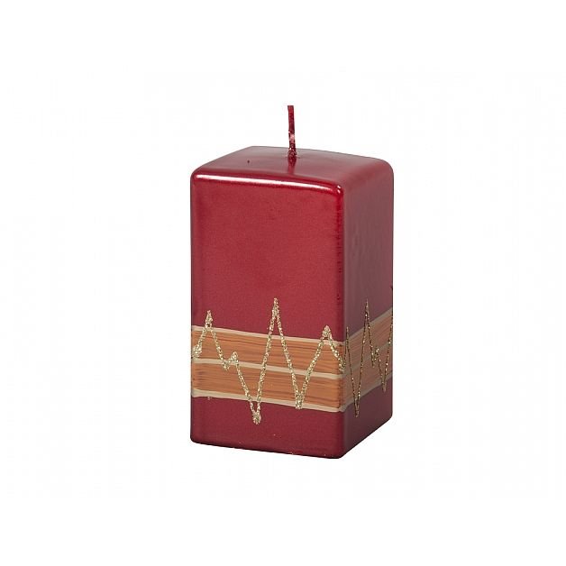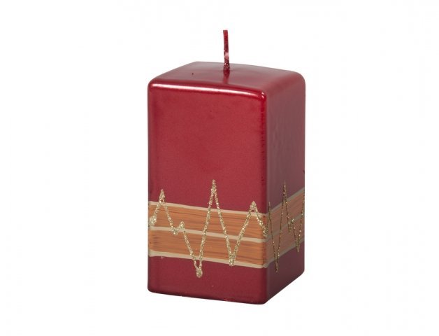 Svíčka zdobená PROUŽEK HRANOL 5,5x5,5x10cm metalicky červenáMetalicky červená svíčka ve tvaru hranolu s rozměry: 5,5x5,5x10cm. Od poloviny výšky svíčky jsou tři úzké zlaté proužky vyplněné oranžovou barvou. Přes proužky jdou zlaté špičaté vlnky. Svíčka je vhodná k použití zejména ve vánočním období jako dekorace do svícnů a pod.