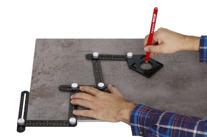 víceučelové skládací pravítko - šablona pro značení, přenos a vytváření speciálních tvarů, úhlů nebo otvorů pro obkladače, podlaháře a jiné profese nejen ve stavebnictví 6 kovových nastavitelných ramen s centimetrovou a palcovou stupnicí masivní aretační šrouby pro přesné a jednoduché nastavení požadovaného tvaru průměry pro značrní otvorů 26, 41 a 46 mm