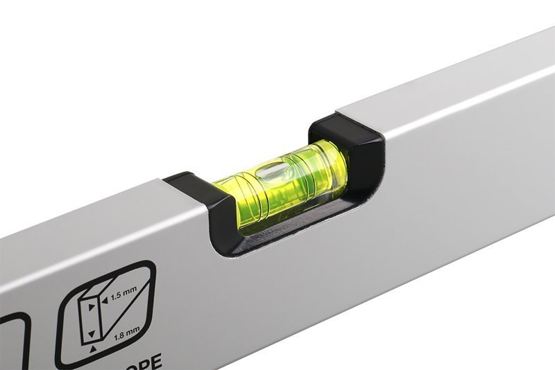inovovaná horizontální válcová libela - snadná viditelnost ze všech úhlů pohledu dvojité kroužky v libele - vnější kroužky pro sklon 2% výraznější fluorescenční kapalina pro lepší viditelnost bubliny na slunci i v horších světelných podmínkách vodováha se dvěma libelami přesnost 0,5 mm/m = 0,0285° tloušťka stěny ALU profilu 1,5 mm, eloxovaný otěruvzdorný povrch vodováha je odolná proti provozním nárazům 10 let záruka na libely, KAŽDÝ KUS ELEKTRONICKY TESTOVÁN