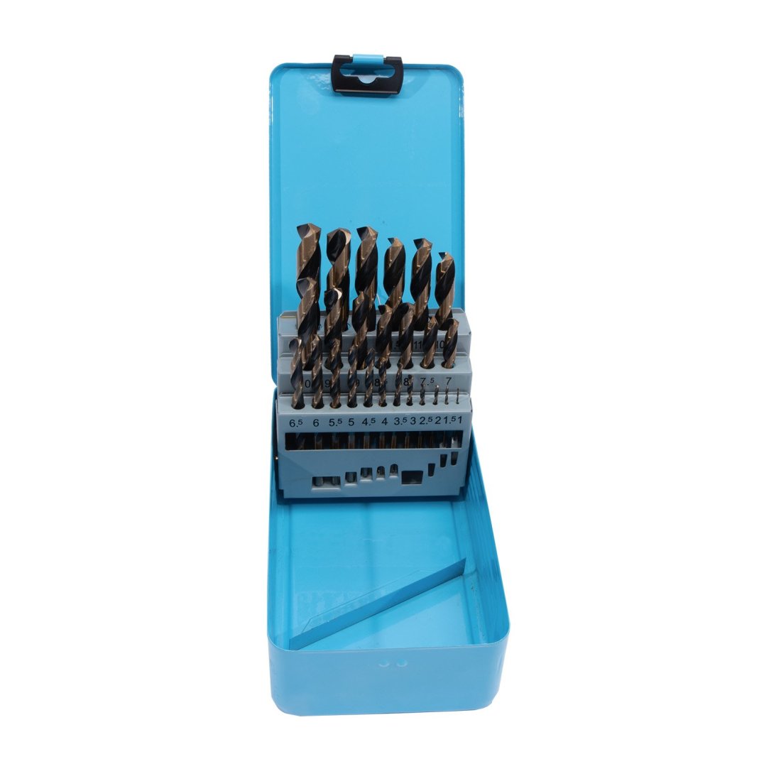 Sada vrtáků do kovu vyrobených z HSS oceli. Vrtáky jsou uloženy v kovovém boxu. Lze opětovně brousit.